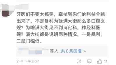 当然,对于牙科暴利的言论,有些牙科医生和从业者自然有自己的看法,但被高额费用困扰的患者显然听不进去他们的解释,毕竟账单就明明白白放在这里,你说出花来我不还是要掏这么多钱。在郑渊洁的微博下面,有网友质问:“不是暴利为什么满大街那么多口腔医院?为啥满大街见不到消化科,神经科医院?”