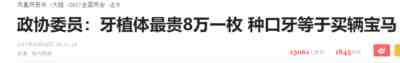 于是网友呼吁:“早该整治了,种一口牙,能买辆宝马车的时代,该过去了。”一口牙能买辆宝马不是网友信口胡诌的,2017年,政协委员、华西口腔医学院主任医师周学东在呼吁医疗器械产业化时表示:“目前医院最贵的牙植体8万元一枚,种一口牙相当于一辆宝马车,这是什么概念?”