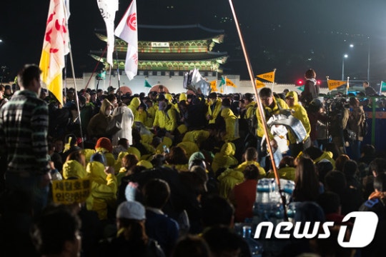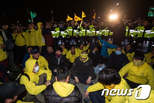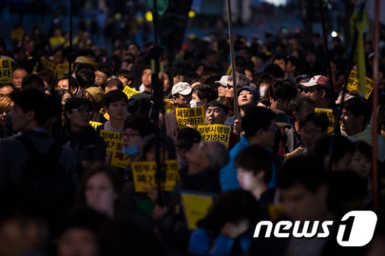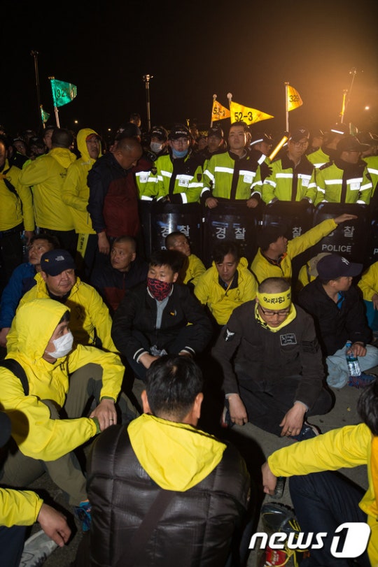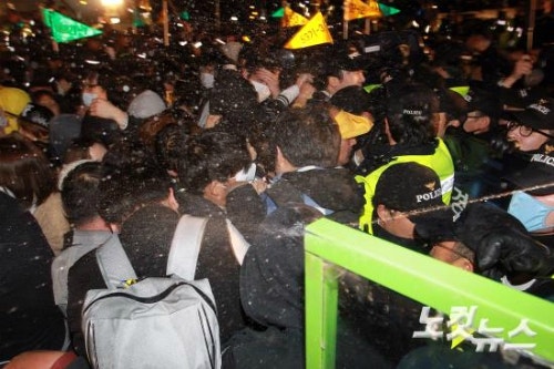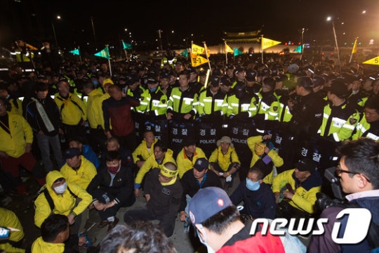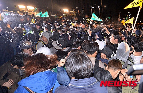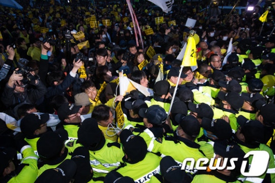 南朝鲜当地时间4月11日,世越号惨案死者家属与“世越号惨案泛国民对此会议”、“416连带”等世越号事件相关的左派团体在首尔市中心光化门广场发起集会,往青瓦台游行示威,伪警阻止时发生激烈冲突。