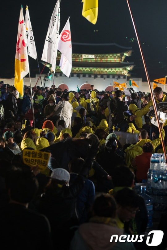 民众手举写有“打捞世越号!废除政府的《实行令》”等内容的标语牌,他们高呼“反对查明真相的朴槿惠政府,下台!”“废除垃圾《实行令》!”等口号,又呼吁警方“不要阻碍和平示威”。接近晚上10时,伪警向示威民众喷射催泪剂。这一天,共有包括死者家属在内的20人被捕。