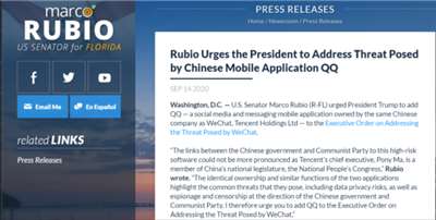 比如,2020年9月,卢比奥发文呼吁白宫将社交软件QQ一同纳入针对微信的行政令中。
