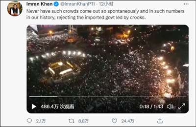 4月10日晚上到11日凌晨,为抗议伊姆兰·汗被罢免,巴各地爆发了示威游行,伊姆兰·汗本人更在11日凌晨发布推特称“在我们的历史上,从来没有如此多的人群自发地站出来,拒绝由骗子领导的进口政府”。