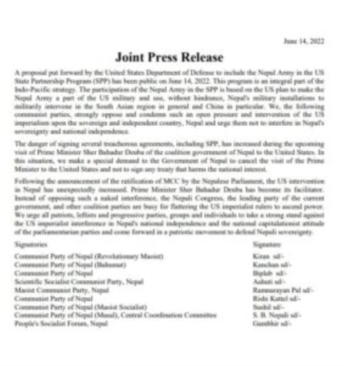 2022年6月14日,尼泊尔九个共产党在加德满都发布联合新闻稿以反对美国国家伙伴关系计划(SPP),谴责美帝国主义对尼泊尔独立与主权的干涉,并敦促所有爱国者发动捍卫尼泊尔主权的爱国运动。(原文链接:https://moolbato.com/2022/06/47088/)