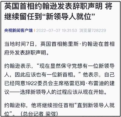 英国首相约翰逊在晚上7点半的时候,正式发表了辞职声明,并表示将继续留任到“新领导人就位”。