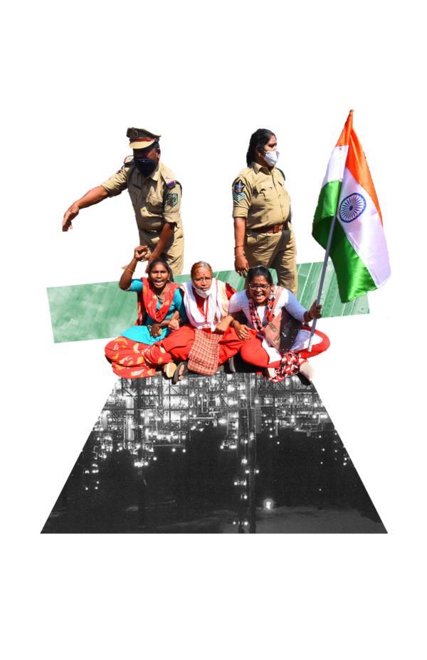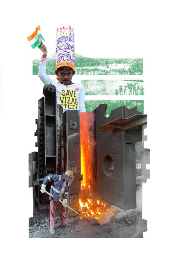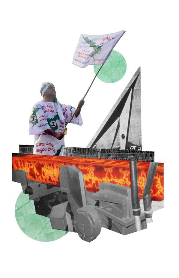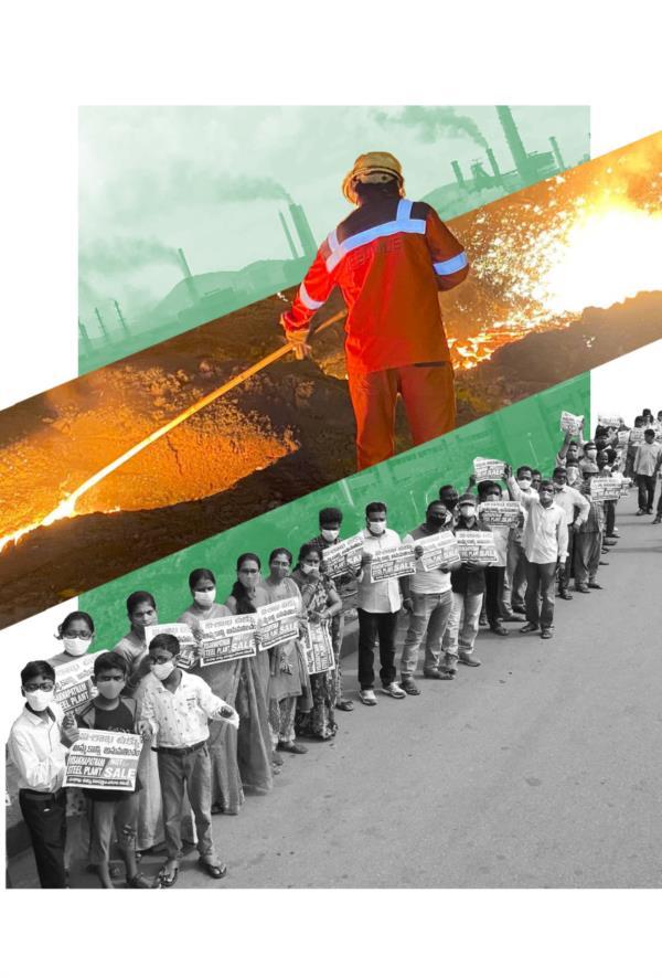 像这样的斗争很少被人书写,领导斗争的英勇钢铁工人大多是被遗忘的,或者哪怕被记住,也是会遭到污蔑。他们站在熔炉旁,将钢铁摊平、锻造,希望为农民造出更好的水渠,为学校和医院建造屋梁,为社区解决民生问题建设基础设施。本期汇编是基于我们与钢铁工人和工会的交流而撰写的,他们讲述了对过往的看法、对斗争的认识。他们还分享了一些照片,加上安得拉邦报纸《般若沙提》昆赫姆·拉杰什所摄照片,三大洲社会研究所艺术部用它们制作了拼贴图,作为该汇编的插图(本期新闻稿也分享了部分插图)。