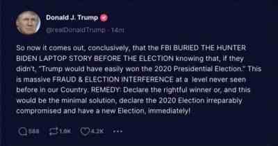 因此,在扎克伯格最新爆料后,特朗普29日在其自创的社交媒体“Truth Social”上发文称,“所以现在事情传出来,有了定论,FBI在大选前掩盖了关于亨特·拜登笔记本电脑的事情,因为他们知道,如果他们不这么做,‘特朗普就会轻松赢得2020年总统选举’。这是我们国家前所未有级别的大规模欺诈和选举干预。补救措施:宣布合法获胜者——这是最简单的解决方案——或者宣布2020年总统选举遭受不可挽回的破坏,并立即举行新的大选!”