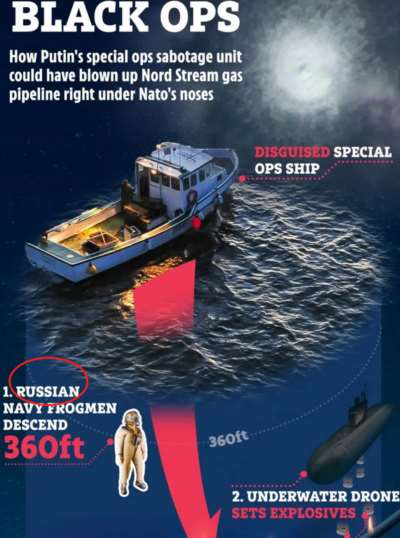 西方的“阴谋论”媒体和所谓的军事专家给出一系列诸如此类的推测,他们甚至详细地画出了“北溪管道被破坏流程图”,把里面的潜水蛙人形象标注为“俄罗斯人”。