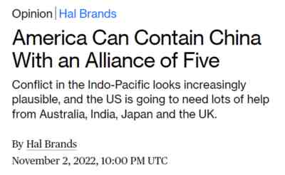 启程当天,3日,他在彭博社专栏发文,标题就直白地提出“美国可以借助一个五国联盟遏制中国”。