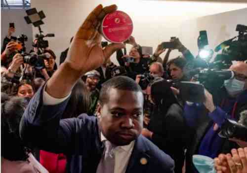 克里斯·亚历山大在百家媒体前高高举起红色包装盒的“西瓜味大麻软糖”,仿佛在宣告人权和自由的胜利!