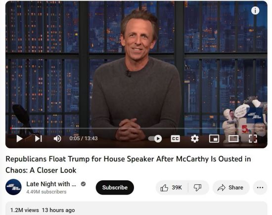 懂王的回应已经足够好玩了,但并不是我们今天要讲的段子。这个段子来自Seth Meyers最新一期的脱口秀节目,理解起来需要初中英语的知识。Seth Meyers说,你们想象一下,一个被法院出具了禁言令的人,现在要当我们美国众议院的Speaker(议长)了诶!简直amazing!
