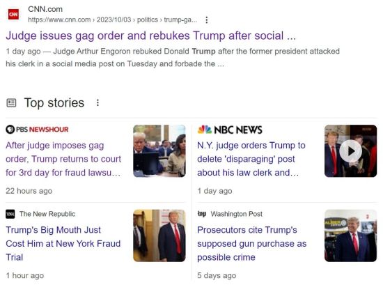 10月3日,懂王在欺诈案中被法官出具禁言令,禁止他在公共场合、社交媒体上发布任何有关法庭执法人员的言论,懂王成为首位收获法院禁言令的(前)总统。