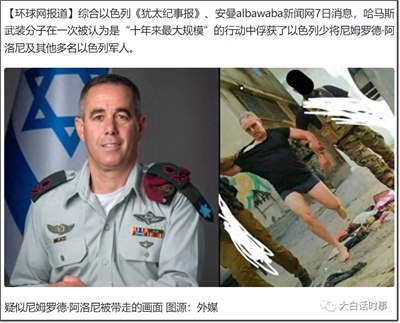 根据媒体报道,以色列少将尼姆罗德·阿洛尼及其他多名以色列军人被哈马斯俘获。