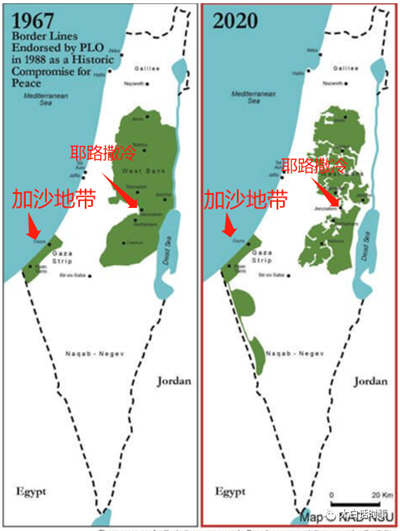 目前国际社会是普遍承认1967年的以色列和巴勒斯坦的边界图,这实际上已经是以色列靠3次中东战争占领得来的,已经占据原本巴勒斯坦领土大部分。