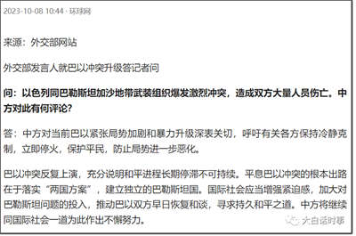 同时,我们发言人也强调“中方对巴以冲突造成平民伤亡感到非常痛心,我们也反对和谴责对平民的暴力和袭击。”