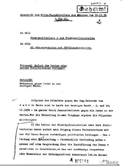 11月10日1点20分,海德里希发特急电报指示手下:“不得阻拦即将发生的示威”,“犹太人教堂可以烧毁,但不得危及德国人的财产”,“犹太人的店铺与私人住宅可以捣毁,但不得劫掠”,“犹太人,特别是有钱的犹太人应予逮捕,人数视现有监狱能容纳多少而定”……