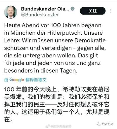 德国总理朔尔茨官方推特纪念的是“慕尼黑啤酒馆暴动”100周年。