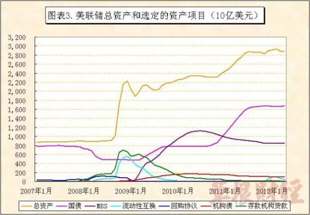 表中除资产收益项外,都是美联储用增发美元购买各种债券形成的资产,而资产收益主要是美联储购买的各种资产的购买价格与当前价格之间的差别,本表将其归总到一起了,也包括少量其他项目如自有资产和待统计项目等。 负债项中存款是商业机构在央行存款,代表的是商业银行等机构的准备金和超额准备金,加上流通货币就是基础货币。从上述美联储资产负债表可以清楚看到,美元增发的主要依据是国债和商业债券。在08年金融危机发生以前,很长时间里主要是国债。08年初基础货币,包括流通货币和存款,共7908.3亿美元,而对应的用于购买国债的货币就有6703.7亿美元,占近90%。发生危机的2008年底曾主要依据商业债券,甚至包括大量垃圾房地产债券增发货币。到现在,基础货币为3.81万亿美元,国债和政府债券占2.21万亿美元,而商业债券主要是两房公司担保的房地产债券(MBS)1.57万亿美元,很多是美国失业的穷人买房的债券。