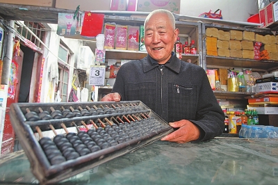 当年习仲勋用过的算盘,刘水柱在自家的小商店里使用至今。许俊文摄