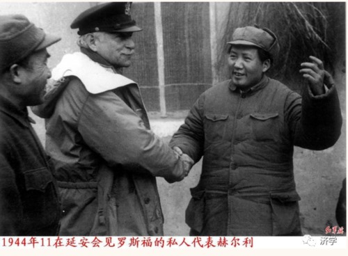 1944年11月7日,美国总统私人特使赫尔利(内定为美国新任驻华大使)在林伯渠陪同下,自重庆飞抵延安,毛主席和中央领导亲临机场迎接。毛主席热情接待了美国客人,并且与之举行了坦率会谈。