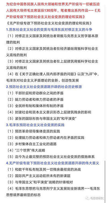 (2)以往研究更侧重于毛主席的科学论断如何符合马克思列宁主义,而笔者的研究更侧重于强调毛主席如何创造性的发展了马克思列宁主义、强调哪些是毛主席首次提出的原创性的贡献,例如首次对修正主义国家及其当权集团进行全面彻底深刻的政治经济和指导思想批判、开创最完整全面的社会主义矛盾理论和预防社会主义社会变质的措施理论。