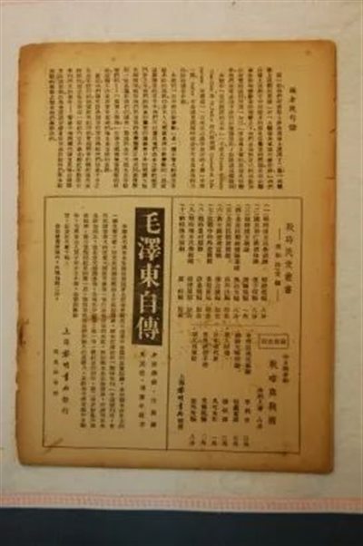 1937年《文摘战时旬刊》第5号刊登《毛泽东自传》单行本即将问世的广告:“本书是毛泽东先生亲向美国著名记者史诺氏口述生平事迹的忠实记录,是中国革命史上的一个重要文献。原文在《亚细亚》月刊上分四期发表,经本社译出在《战时旬刊》中连续刊出,曾引起读者莫大注意。现原文最后一章已由航空寄到本社,经汪衡先生全部译出,并请周民先生详加校正,改正原文错误多处。全传共分四章:第一章,一颗红星的幼年;第二章,在动乱中成长起来;第三章,揭开红史的第一页;第四章,英勇忠诚和超人的忍耐力。并附加毛泽东论中日战争、毛泽东夫人贺子珍女士小传。全书四万余字,珍贵照片数十幅,每册售洋两角,外埠加邮二分。”[3]