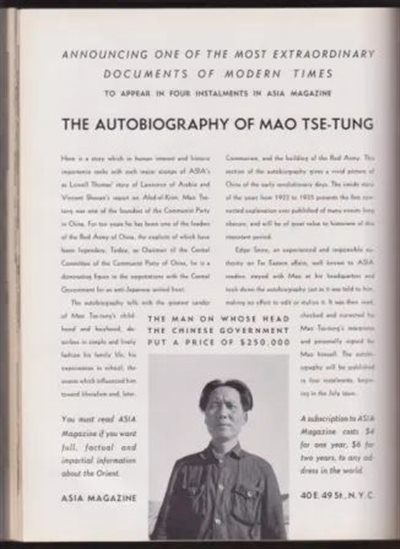 从保安回到北平的斯诺,1937年春应美国纽约《亚细亚》(即《ASIA》)月刊编辑的要求,以《毛泽东自传》为题,将他关于毛泽东生平的访谈集中整理成文,于1937年7月至10月,在《亚细亚》月刊第37卷第7号至第10号上连载。