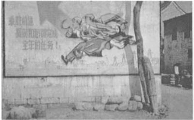 4.阳邑县城墙上的壁画。口号是:“乘胜前进,提前和超额完成全年的任务”。