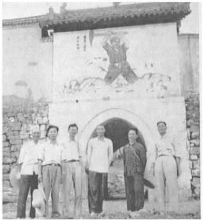 2.乡村壁画展示了前进中的农民劈开道路上的大山。壁画前站着的是县政府的干部。(县长王德恒身穿深色制服)