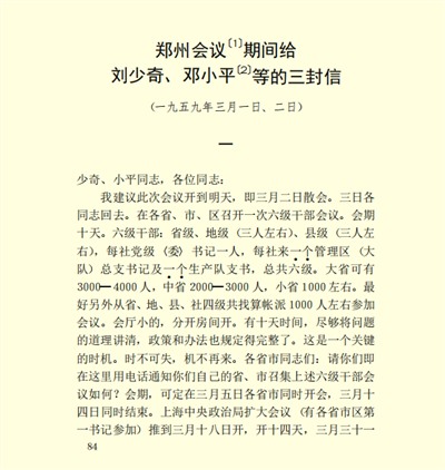 ......此信请xx、xx二位同志提向今天上午的会议,议一下,看是否适宜。有不适宜的地方加以修改。听了昨天十位同志的意见,我感觉有一些同志对我讲的那一套道理,似乎颇有些不通,觉得有些不对头,对他们那里的实际情况不相符合,感觉我的道理有些不妥。当然还待商量。我可以这样说,同志们的思想有些是正确的,但是我觉得我的观察和根本思想是不错的,但是还不完善。有些观点需要同志们给我以帮助,加以补充、修正及发展。我的这一套思想,是一月二月两个月内逐步形成的。到天津、济南、郑州,跟三省同志们交换意见,对我有极大的启发。因此到郑州,就下定了决心,形成了一套,虽然还有些不完善,还有些不准确,还有些需要发展和展开,需待今后再观察、再交换意见,再思再想。我准备三月十四日到上海。我要看一看河南六级干部会议的进展情况,还须呆四五天,看看他们想些和讲一些什么。武汉、长沙、南昌、杭州、上海各有几天商谈。建议请同志们认真、仔细、热情地读一读河南此次六级干部会议的详细记录,二月甘七、廿八两天的记录,极有味,极有益,其中有许多批评我右倾和倒退的意见。同志们如能再呆两天可以多带两天的记录回去。我已叫省委办公厅在今天九时左右将头两天记录送给你们,请你们收到即读,两小时即可完毕。读完再举行会议,讨论我所提出的人民公社问题。吴芝圃〔3〕同志:今天晚上不要看戏,改在明晚看。因为我要在下午和晚上,跟同志们商量已经提出的问题。
