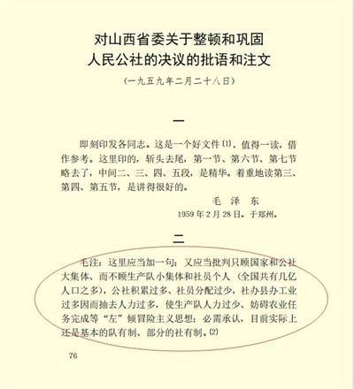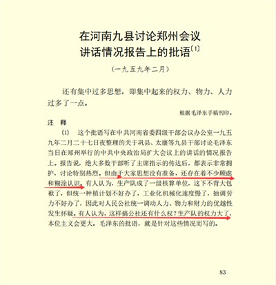“党委大批评生产队,生产小队的本位主义、瞒产私分,另一方面,生产队、生产小队却几乎普遍地瞒产私分,甚至深藏密窖,站岗放哨。以保卫他们的产品。我认为,产品本来有余,应该向国家交售而不交售的这种本位主义确实是有的,犯本位主义的党员干部是应该受到批评的。但是有很多情况并不能称之为本位主义。即令本位主义属实,应该加以批评,在实行这种批评之前,我们也必须首先检查和纠正自己的两种倾向,即平均主义倾向和过分集中倾向。所谓平均主义倾向,即是否认各个生产队和各个人的收入应当有所差别。而否认这种差别。就是否认按劳分配,多劳多得的社会主义原则。所谓过分集中倾向,即否认生产队的所有制,否认生产队应有的权利,任意把生产队的财产上调到公社来。”