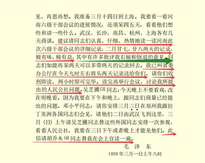 在1959年3月1日上午,毛主席批示的信印证了《毛泽东大传》的结论。此信附后。