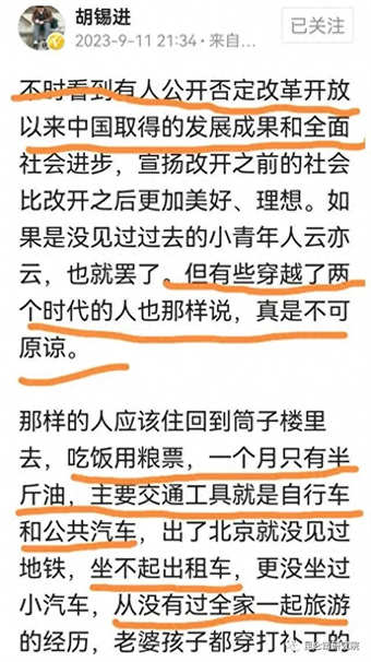 本月11日,胡锡进先生发布了一篇长文,开宗明义指出:“不时看到有人公开否定改革开放以来中国取得的发展成果和全面社会进步,宣扬改开之前的社会比改开之后更加美好、理想。如果是没有见过过去的小青年人云亦云,也就罢了。但有些穿越了两个时代的人也那样说,真是不可原谅。”紧接着,老胡用了大量篇幅诉前三十年,也就是毛泽东时代的“苦”。在老胡眼里,毛泽东时代简直“苦不堪言”“不堪回首”(胡文太长,我不引原文了)。