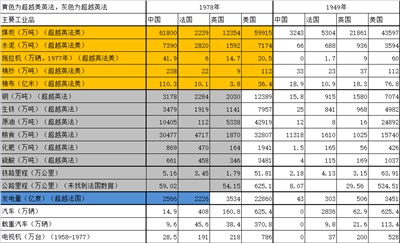 附图:新中国1949年、1978年主要工业品统计表(黄色为产量超越美国、英国、法国;灰色为产量超越英国、法国;灰色为产量超越法国)