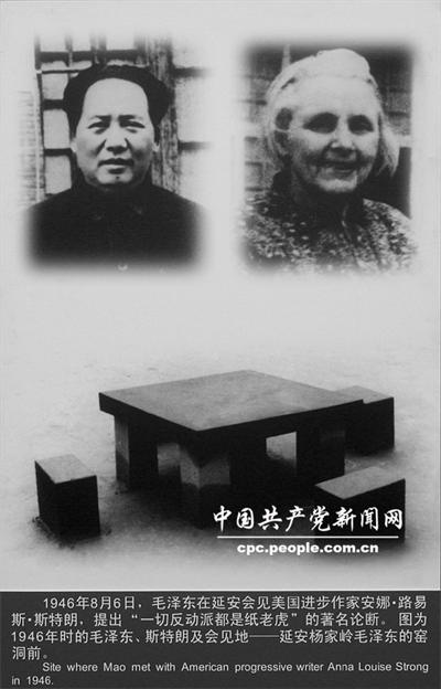 1946年8月里的一天,毛泽东主席在延安杨家岭自己居住的窑洞门外会见了这位个性非凡的美国女记者安娜·路易斯·斯特朗。