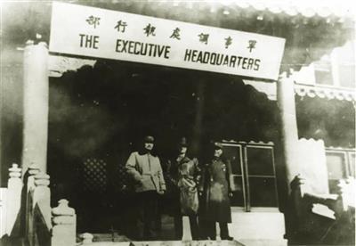 ◆军调部三委员——中共代表叶剑英(左)、国民党代表郑介民(右)、美国代表饶伯森(中)在协和医学院军调部办公楼前。