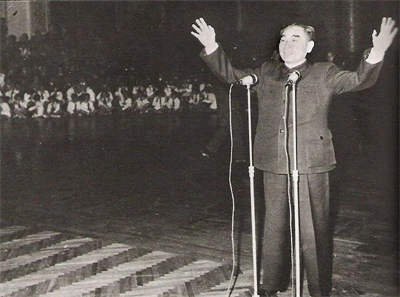 ▲周恩来对《东方红》歌唱团员宣布中国成功爆炸了第一颗原子弹。来源新华网