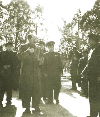 ◆1956年,陈伯钧(中)、刘伯承(后)等陪同毛泽东视察南京军事学院。
