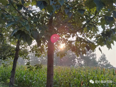 10月7日阴天,10月8日太阳出来了,下午我就要回北京。早上我抓紧时间又到岭上的地里观察土壤的湿度,看到了阳光照射后的田野上升起了薄雾,说明土壤中的水分饱和了,只能靠阳光照射来“蒸发”。估计还要再晒一二天才能进到地里收玉米。