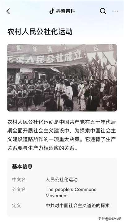 关于当年的人民公社,“抖音百科”里是这样解释的:农村人民公社化运动是中国共产党在五十年代后期全面开展社会主义建设中,为探索中国社会主义建设道路所作的一项重大决策。它违背了生产关系要与生产力相适应的关系。