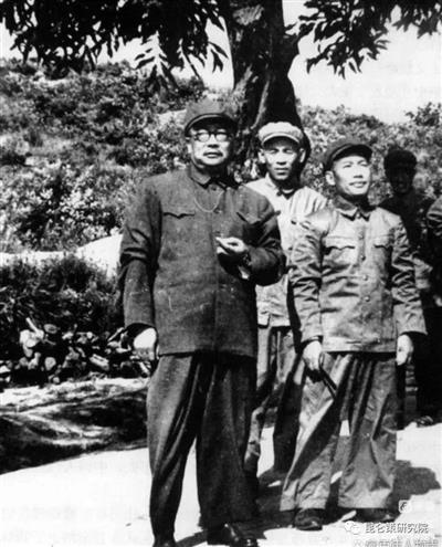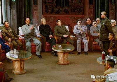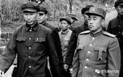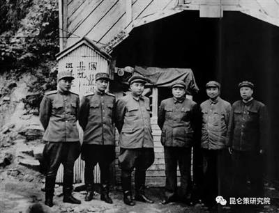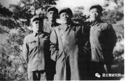 【1951年秋,朝鲜战争期间,中朝将领在中国人民志愿军司令部门外合影。左起:刘京珠、朴一禹、金日成、彭德怀、陈赓、甘泗淇】