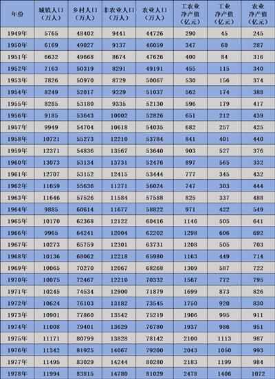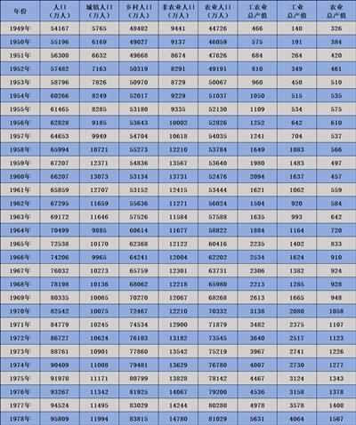 新中国前三十年工农总产值、工业产值、农业产值以及人口构成(如下表):