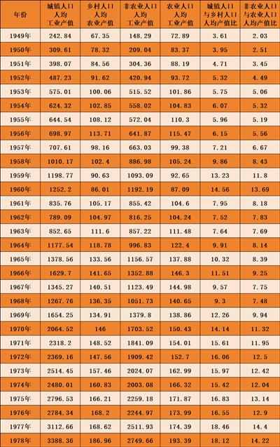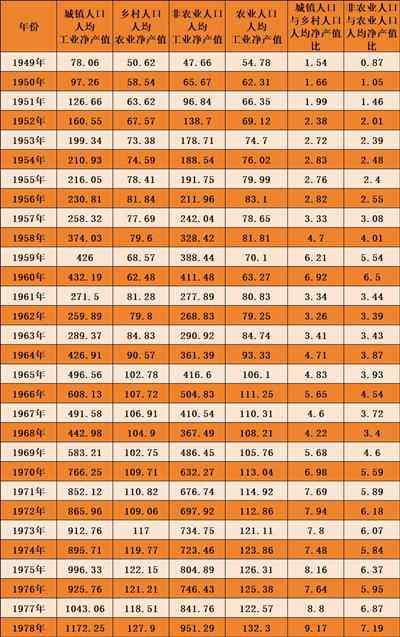 从表中可以看到新中国前三十年工人的人均产值要远远高于农民人均产值。