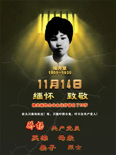 她是中国共产党创建时期最早的优秀党员之一,是中国妇女解放运动的倡导者和实践者。她是毛泽东心中的“骄杨”,她以满腔的热情,追随毛泽东致力于民族独立和人民解放事业,直到生命最后一刻。在敌人的威逼和利诱面前,她不为所动,始终大义凛然。她是杨开慧。1930年11月14日,为了信仰,她从容地走向刑场,英勇就义。