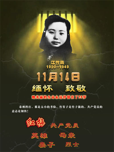 她是小说《红岩》中江姐的人物原型。她因叛徒出卖被捕入狱,受尽酷刑却坚贞不屈:“毒刑拷打,那是太小的考验。竹签子是竹子做的,共产党员的意志是钢铁!”她是江竹筠。1949年11月14日,在重庆解放前夕,她被国民党军统特务杀害于渣滓洞监狱。