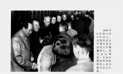▲1956年4⽉30⽇⾄5⽉10⽇,⽑主席接⻅全国先进⽣产者代表 图⽚来源:《中华⼈⺠共和国⽇史》