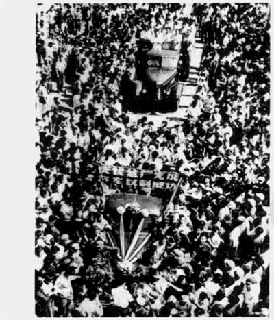 ▲ 我国第⼀汽⻋制造⼚的全体职⼯欢呼和簇拥披红戴花的解放牌汽⻋⾏驶在⼚区的⼤道上图⽚来源:《中华⼈⺠共和国⽇史》