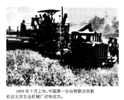 1955年7⽉9⽇,中国⾃制的第⼀台⾕物联合收割机,由北京农业机械⼚试制成功。它是根据苏联样机仿制的,每⼩时割⻨30亩。