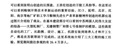 1955年1⽉16⽇,1⽉16⽇《⼈⺠⽇报》报道,鸡西矿⼭机械⼚⽣产的⼗台采煤康拜因已全部完成,并在1⽉上旬进⾏了试⻋。其中⼀台将参加莱⽐锡国际博览会。⼯⼚在试造采煤康拜因时,曾得到了苏联专家西卓夫、谢杰尼柯夫的帮助。试⻋结果证明,产品质量与精度很⾼,机体的牵引、截割、破碎及装载等重要部分都达到了苏联设计的标准。