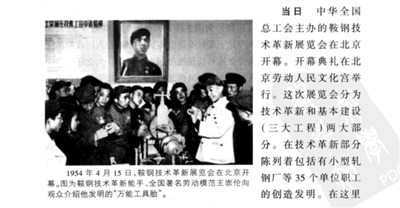 1954年1⽉1⽇,重⼯业部发出《关于学习王祟伦⾸创精神的通报》。⽟崇伦是鞍钢机械总⼚的⻘年⼯⼈,曾先后⼋次改进⼯具,并创造了“万能⼯具胎”,提⾼了⽣产效率,解决了⻋间设备不平衡问题。