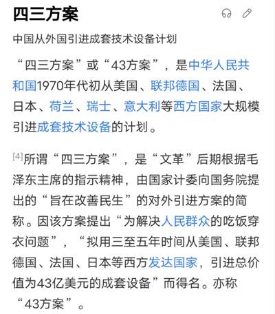 所谓的“四三方案”就是指:从美国、联邦德国、法国、日本、荷兰、瑞士、意大利等西方国家大规模引进总价值为43亿美元的成套设备。